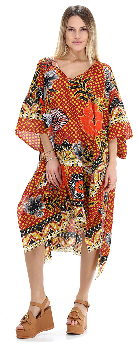 Pareo a kimono in cotone con scollo a V frontale e frange sul fondo. Fantasia etnica. La modella è alta 1.68 ed indossa la taglia unica.
