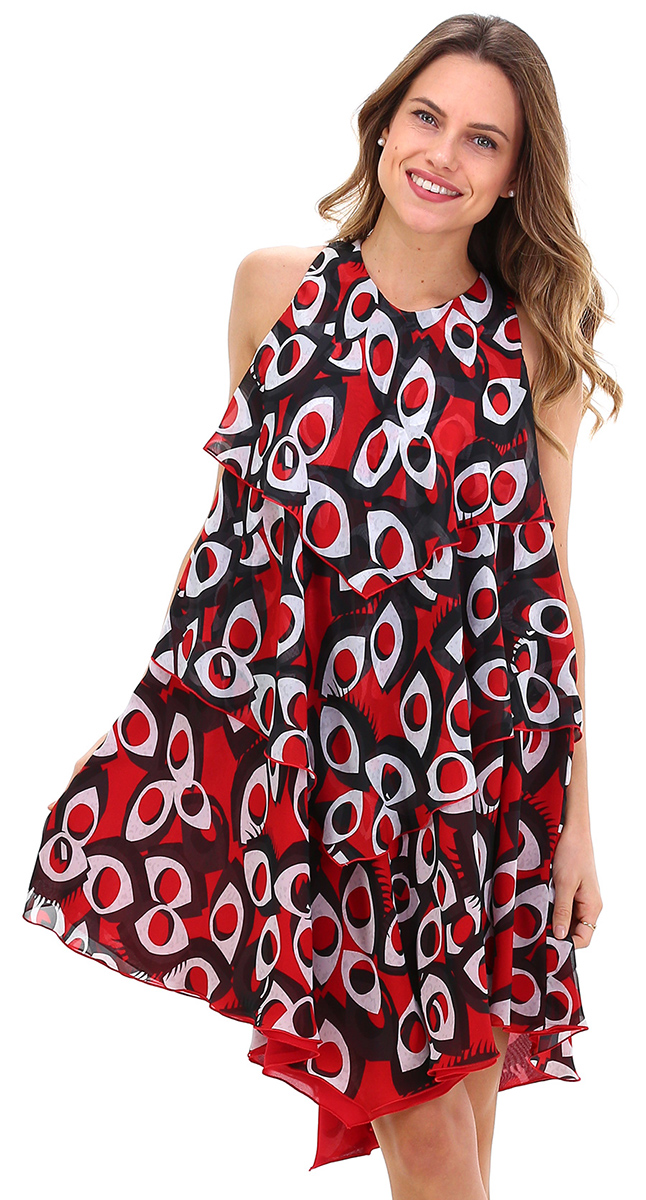 Abito a volant a fantasia svasato sul fondo a girocollo smanicato. Chiusura a bottone sul retro, la modella è alta 1,68 ed indossa la taglia S.