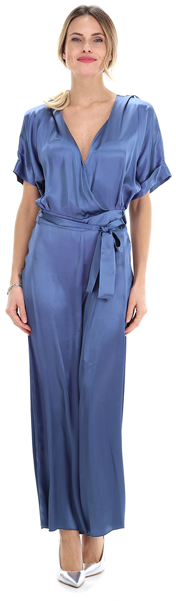 Tuta morbida in raso di misto seta. Scollo profondo incrociato fronte e retro. Zip di chiusura laterale e coulisse in vita. La modella è alta 1.68 ed indossa la taglia 40.
