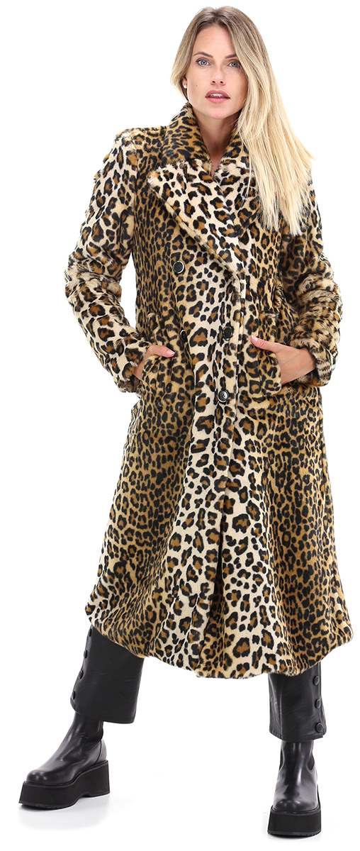 Pelliccia in fake fur foderata. Maniche lunghe e collo a lancia. Tasche a pattina e bottoni di chiusura frontali. Spacco sul retro. Fantasia animalier. La modella è alta 1,68 cm ed indossa la taglia 40.