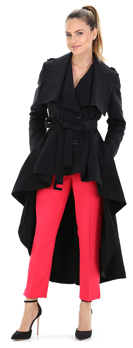 Trench sfoderato con fondo svasato asimmetrico, maniche lunghe, collo ampio, tasche a sacchetto laterali e bottoni di chiusura a doppio petto frontale. Cintura inclusa. La modella è alta 1,68 e indossa la taglia 40.