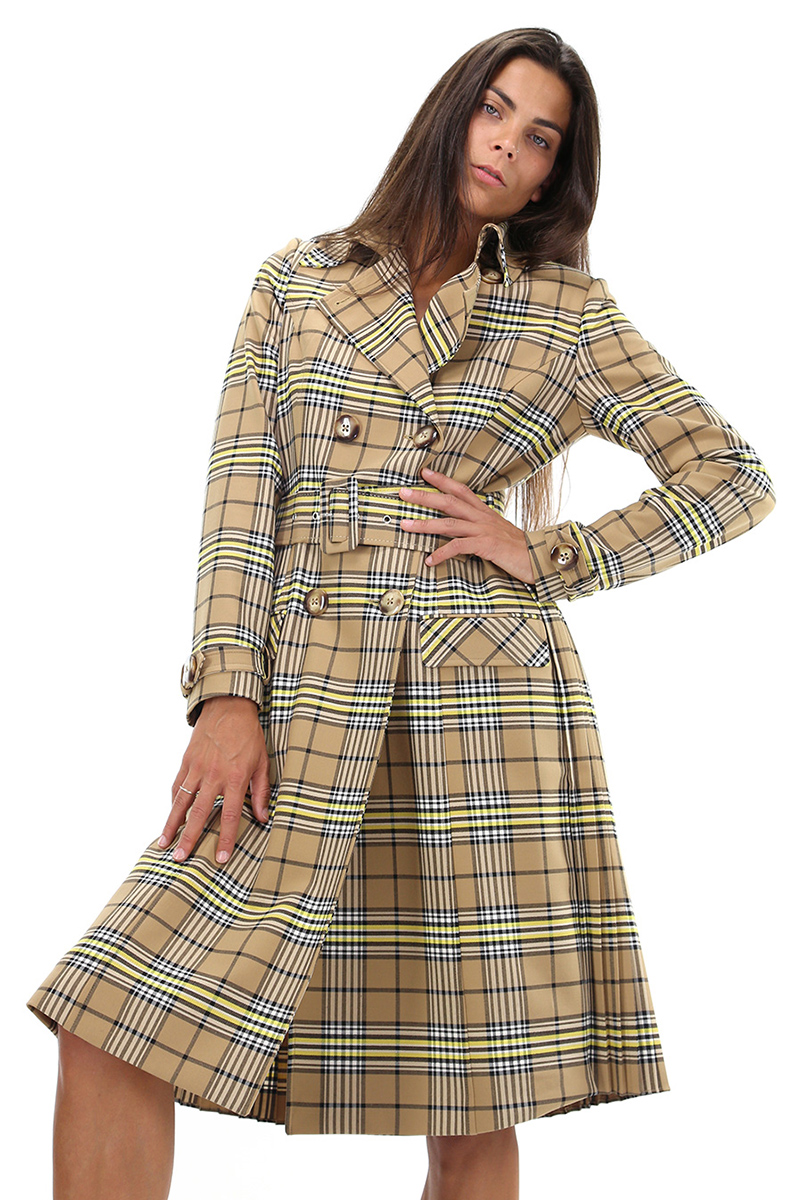 Cappotto trench semi foderato in misto viscosa a maniche lunghe e collo a reverse. Tasche a pattina frontali. Retro plissettato. Cintura inclusa. Fantasia check. La modella è alta 1,71 cm ed indossa la taglia 40.