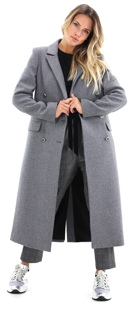 Cappotto misto lana foderato a maniche lunghe e collo a lancia. Tasche con pattina e spacco sul retro. Bottoni di chiusura silver a doppio petto frontale. La modella è alta 1,68 cm ed indossa la taglia XS.