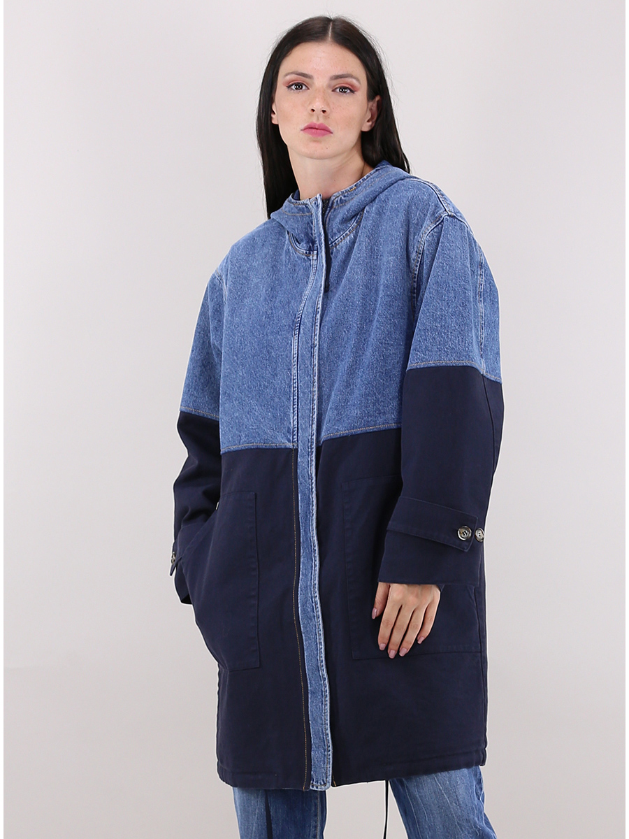 Parka patchwork imbottito Manila Grace in denim di cotone e cotone. Maniche lunghe e collo a cappuccio. TAsche a toppa e zip di chiusura frontale. Coulisse sul fondo. La modella è alta 1,80 cm ed indossa la taglia 38.