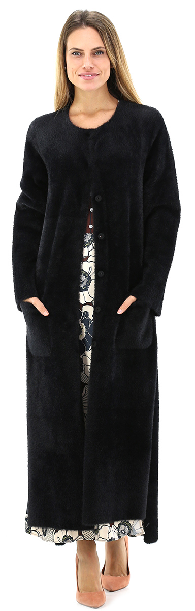 Cappotto in misto viscosa in punto pelliccia con ampi spacchi laterali e collo tondo. Maniche lunghe, tasche a toppa e automatici di chiusura frontali. La modella è alta 1.68 ed indossa la taglia S.