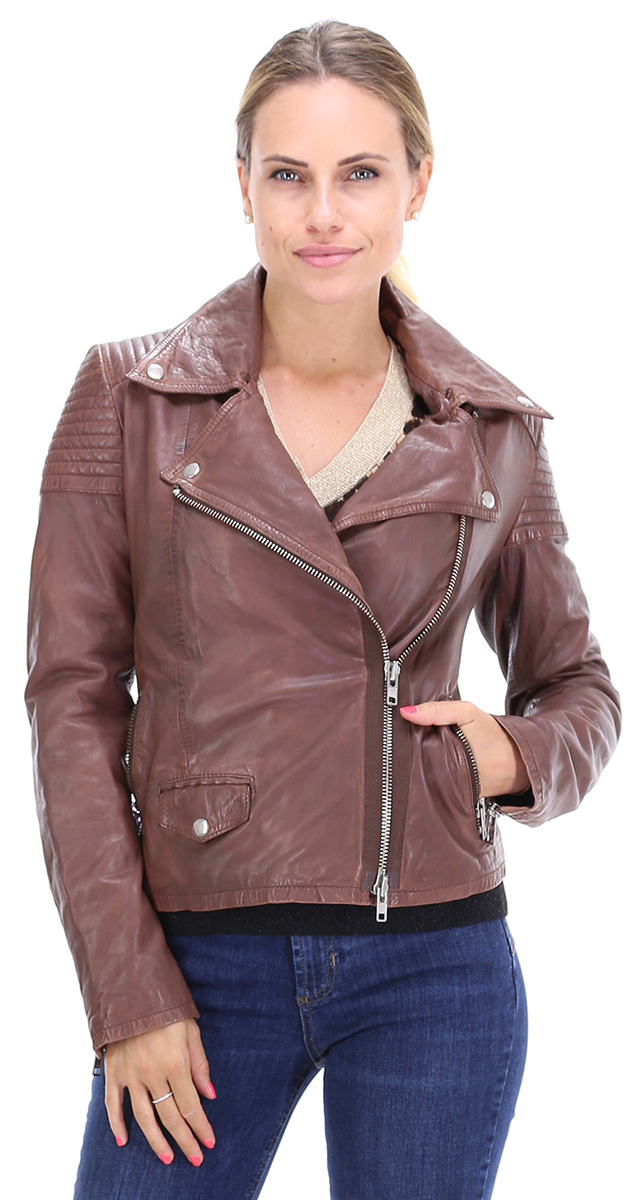 Chiodo in pelle foderato a maniche lunghe con spalle imbottite. Tasche a sacchetto con zip frontali. La modella e' alta 1,68 e indossa la taglia 40.