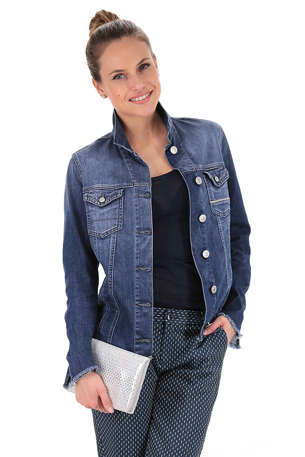 Giacca stile camicia in cotone, maniche lunghe con fondo taglio vivo frangiato. La modella è alta 1,68 ed indossa la taglia S.
