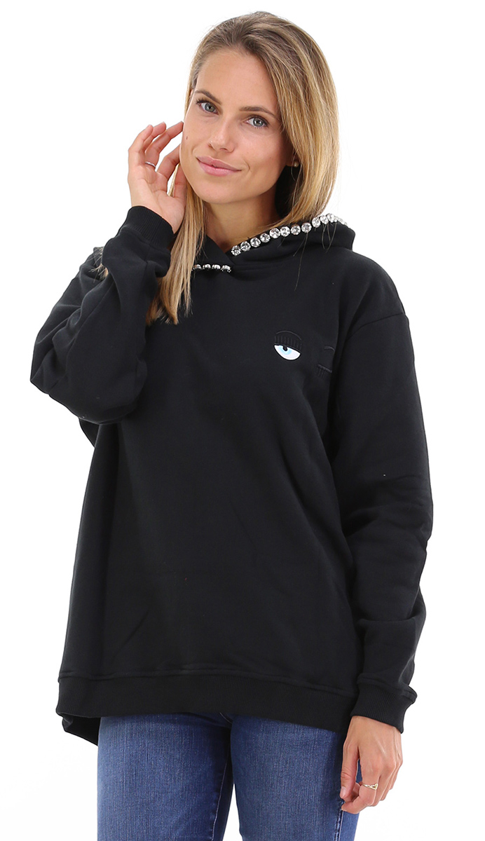 Felpa oversize in cotone a maniche lunghe. Cappuccio con strass applicati. Logo frontale. La modella è alta 1.68 ed indossa la taglia S.