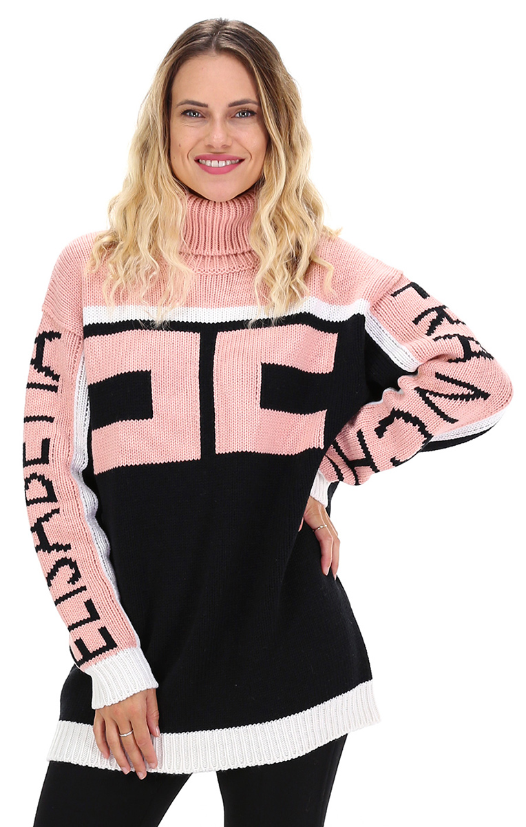 Maglia oversize in misto lana a maniche lunghe e collo a dolce vita. Fantasia logata multicolor frontale. La modella è alta 1,68 m ed indossa la taglia 44.