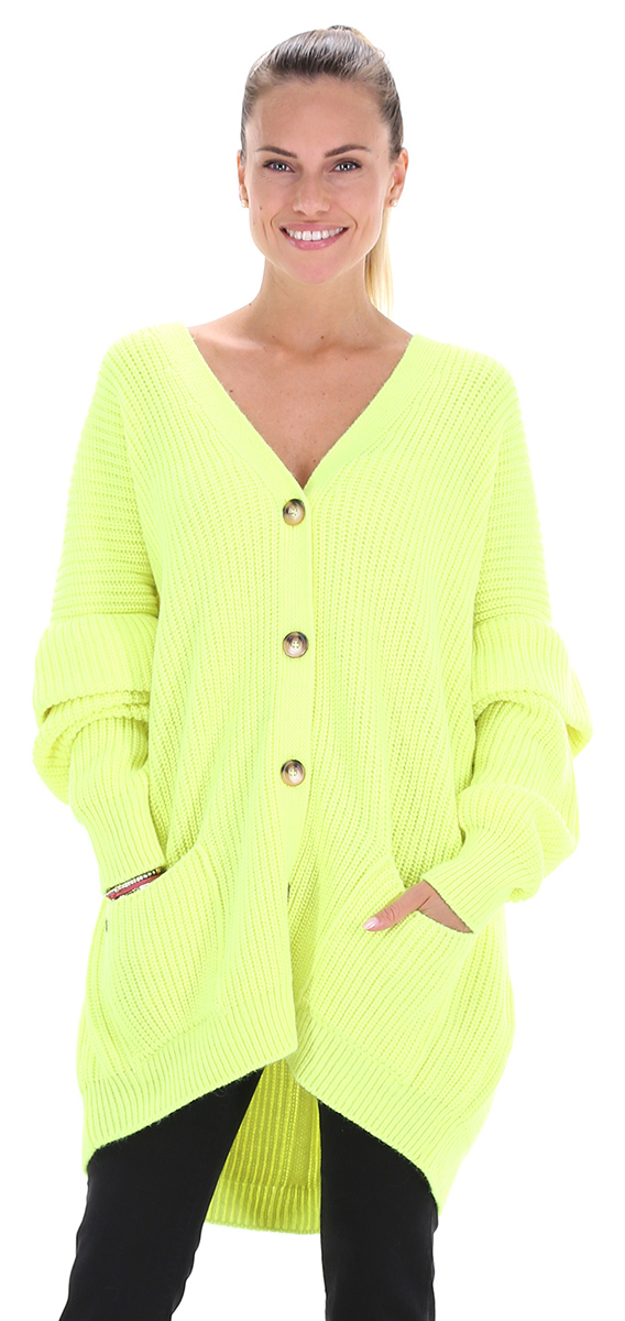 Cardigan a coste in misto lana vestibilità oversize. Maniche lunghe e tasche a toppa frontali. La modella è alta 1.68 ed indossa la taglia XS.