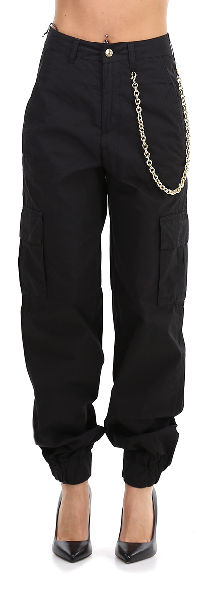 Pantalone cargo oversize in cotone a vita alta. Catena staccabile gold elogo a vista sul retro. La modella è alta 1.68 ed indossa la taglia XS.