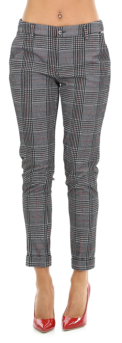 Pantalone a tubino in misto viscosa con tasche all'americana sui fianchi. Fantasia principe di Galles. La modella è alta 1.68 ed indossa la taglia 38.