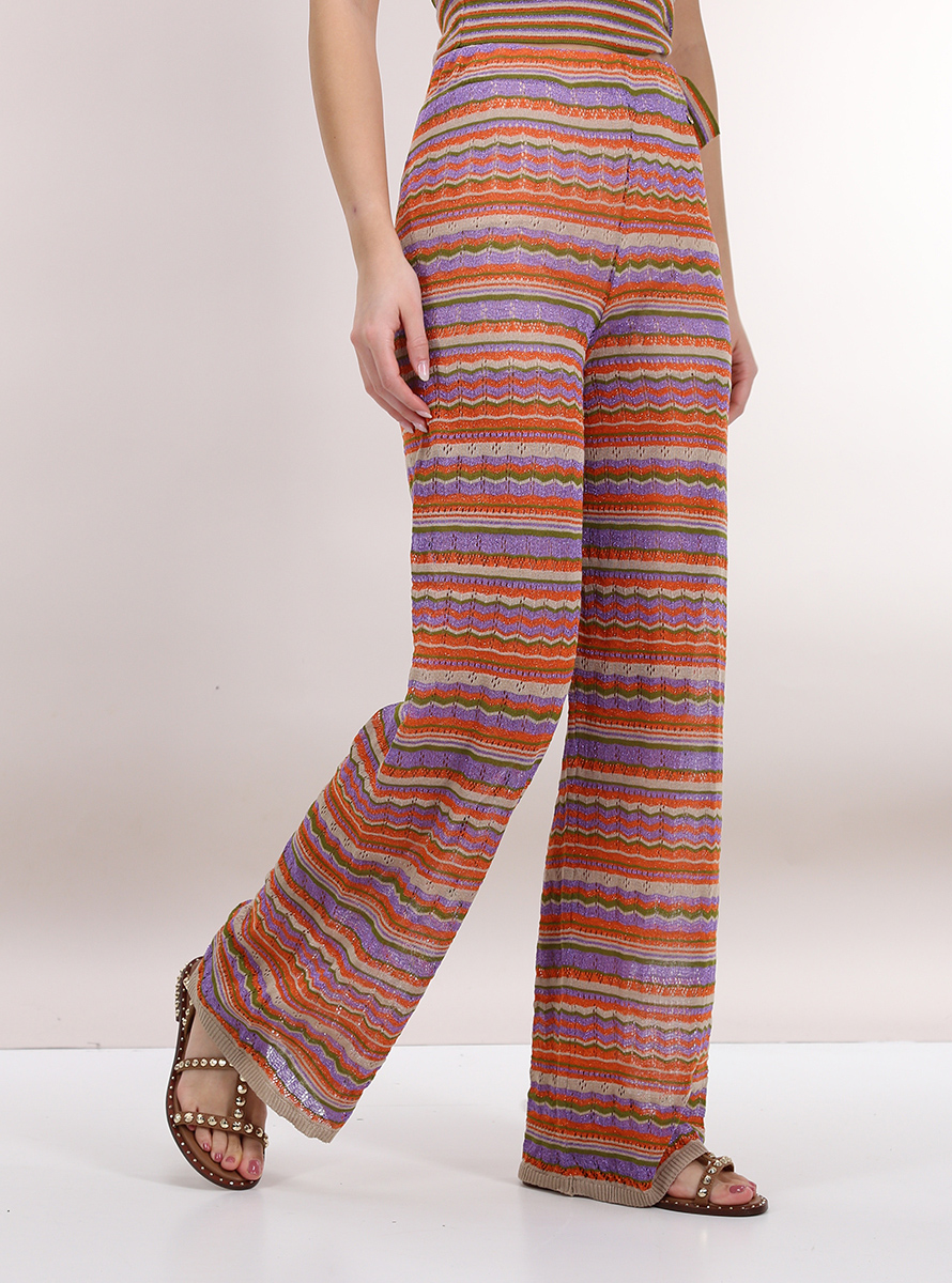 Pantalone a palazzo lavorato Liu Jo con coulotte. Vita alta con elastico. Fantasia a righe multicolor. La modella è alta 1,70 ed indossa la taglia XS.l