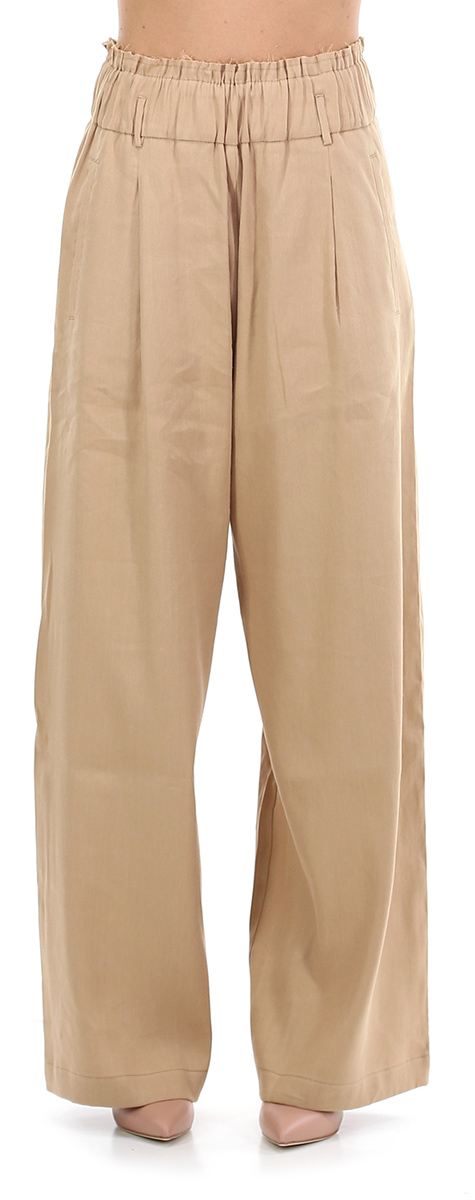 Pantalone palazzo in misto lino con tasche a filetto frontali. Elastico in vita. La modella è alta 1,68 ed indossa la taglia 38.