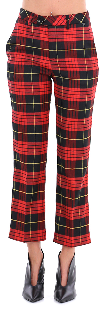 Pantalone a trombetta in misto lana e viscosa con tasche all'americana e a filetto sul retro. Fantasia scozzese. La modella è alta 1.68 ed indossa la taglia 38.