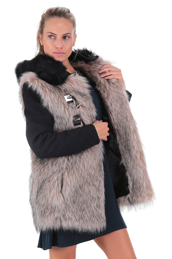 Pelliccia foderata in pelliccia ecologica con cappuccio e tasche laterali. Ganci a scomparsa sul davanti.