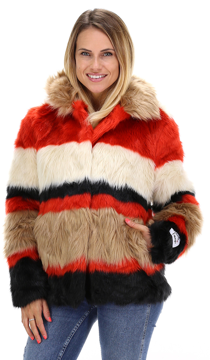 Pelliccia in fake fur foderata a maniche lunghe e collo a fascetta. Tasche a sacchetto e automatici di chiusura frontali. La modella è alta 1.68 ed indossa la taglia XS.