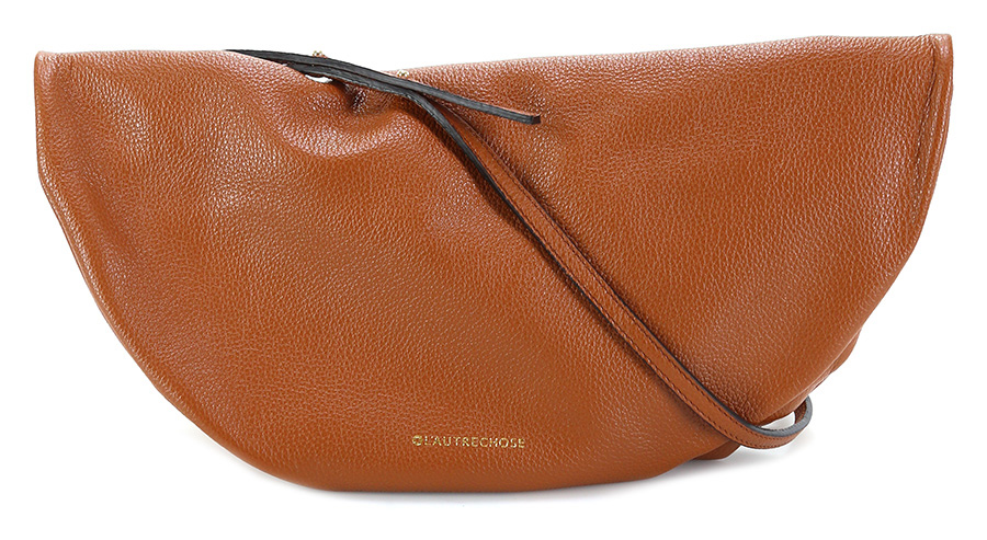 Borsa a mezza luna in pelle martellata con patella di chiusura. Logo frontale e tracolla inclusa. Misure 39 x 21 cm. Dettagli gold.
