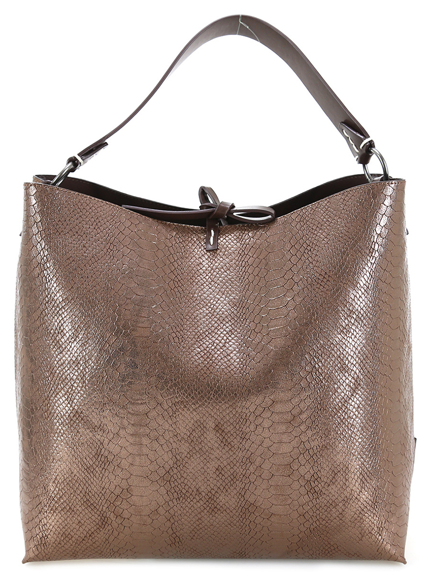 Borsa in eco pelle effetto pitonato con chiusura a laccio. Sacca interna estraibile. Misure 36 x 34 cm. Dettagli silver.