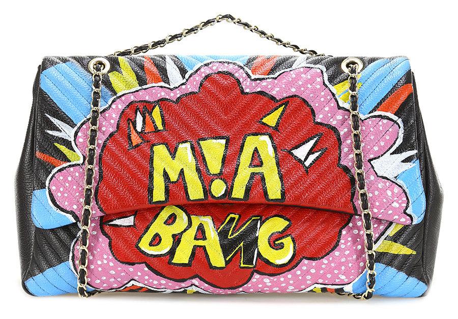 Borsa in pelle martellata e chiusura clip. Illustrazione frontale dipinta a mano. Tracolla morbida in pelle e metallo. Misure 47 x 30cm. Dettagli gold.