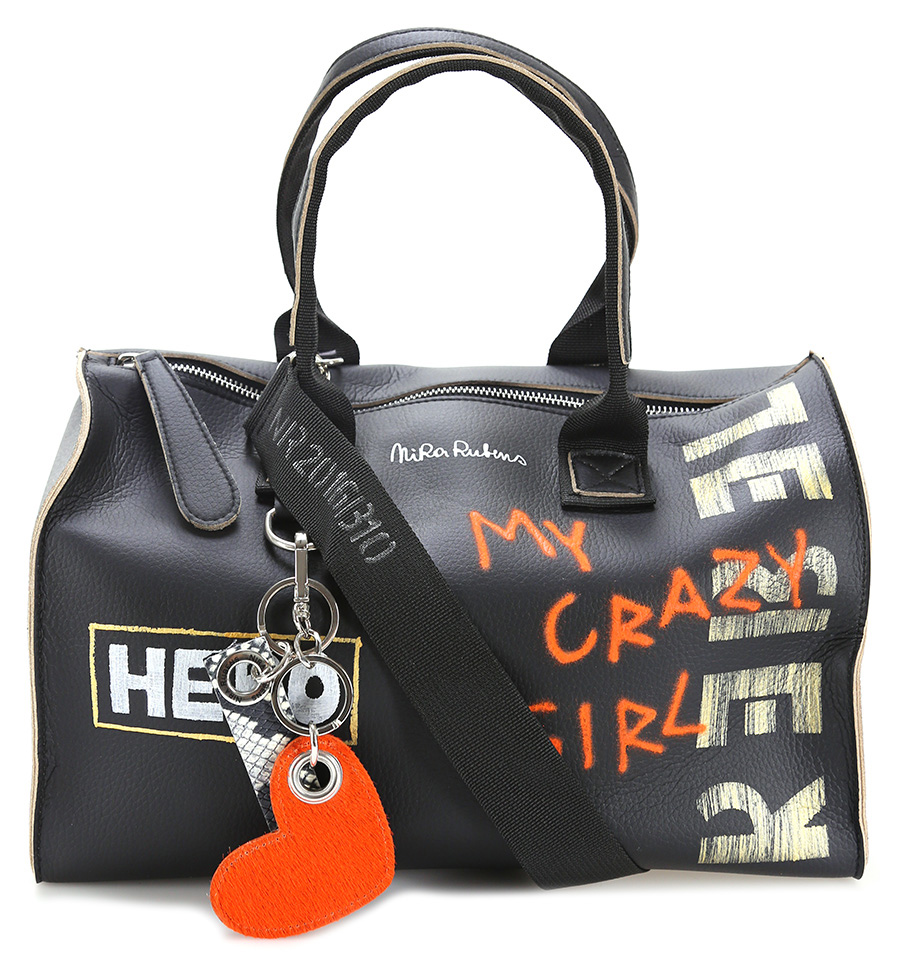 Borsa in eco pelle con chiusura zip. Logo e scritte paintbrush. Portachiavi inclusi. Tracolla inclusa. Misure 36 x 23 cm. Dettagli silver.