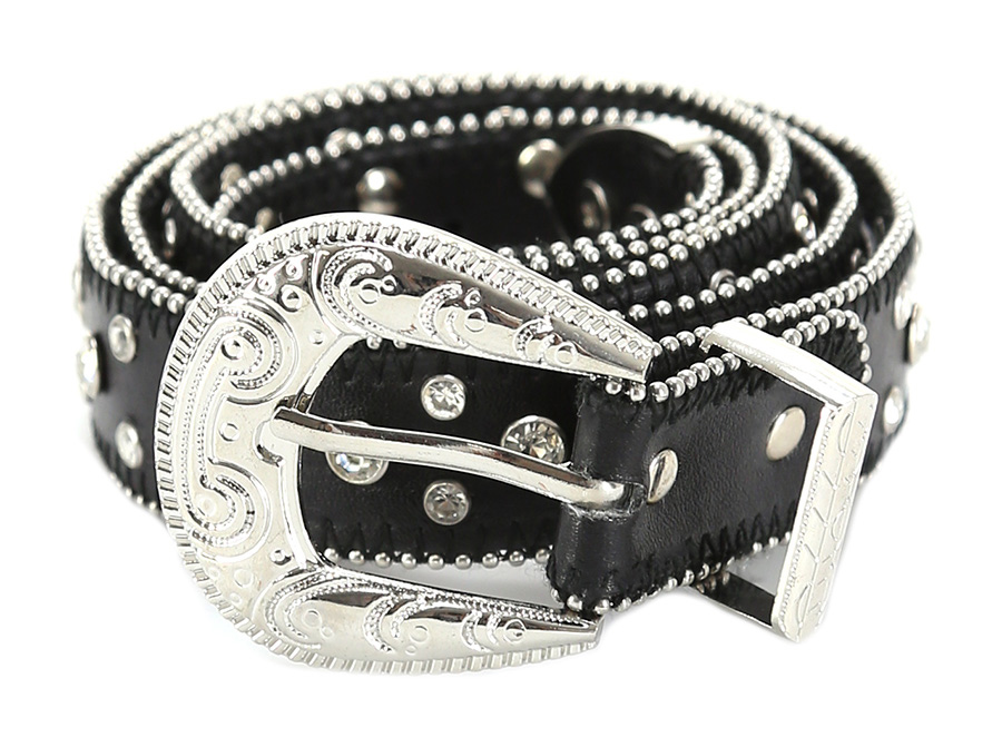 Cintura in eco pelle con fibbia metallica, altezza 2,5 cm. Borchie gioiello applicate.