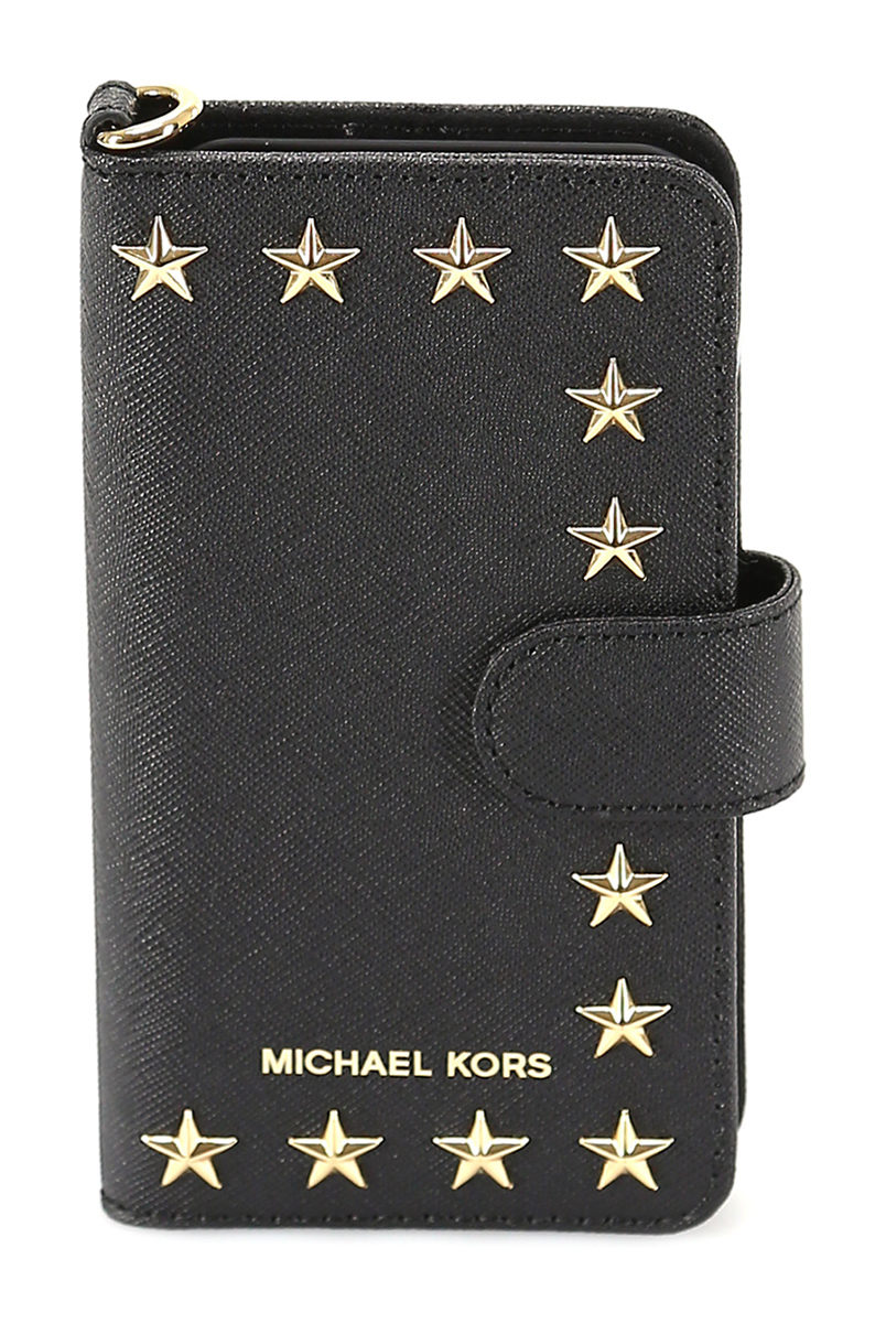 Cover folio per cellulare in pelle saffiano con chiusura magnetica e scomparto interno porta tessere. Stelle metalliche gold e logo in rilievo sul fronte. Misure 8 x 14,5 cm.