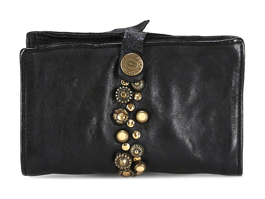 Portafoglio in pelle con bottone di chiusura. Dettagli applicati. Scomparti porta tessere, porta banconote e porta monete interni. Misure 16 x 10 cm. Dettagli gold.