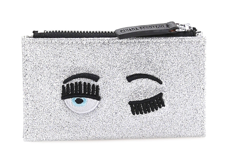 Portafoglio in eco pelle ricoperto di glitter con chiusura zip. Scomparti porta tessere esterni e porta monete interni. Misure 13 x 8 cm. Dettagli silver.