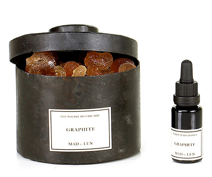 Graphite è una fragranza unisex di nicchia dalle note legnose aromatiche. Contiene note di carta, muschio, inchiostro, canfora, pino e cuoio. Il pot pourri è composto da pietre d'ambra 100% naturali imbevute di olio essenziale. Misure 9,5 x 11,5 cm. Essenza con contagocce 15ml inclusa. Tutti i prodotti MAD et LEN sono VEGAN, CRUELTY FREE ed ARTIGIANALI.