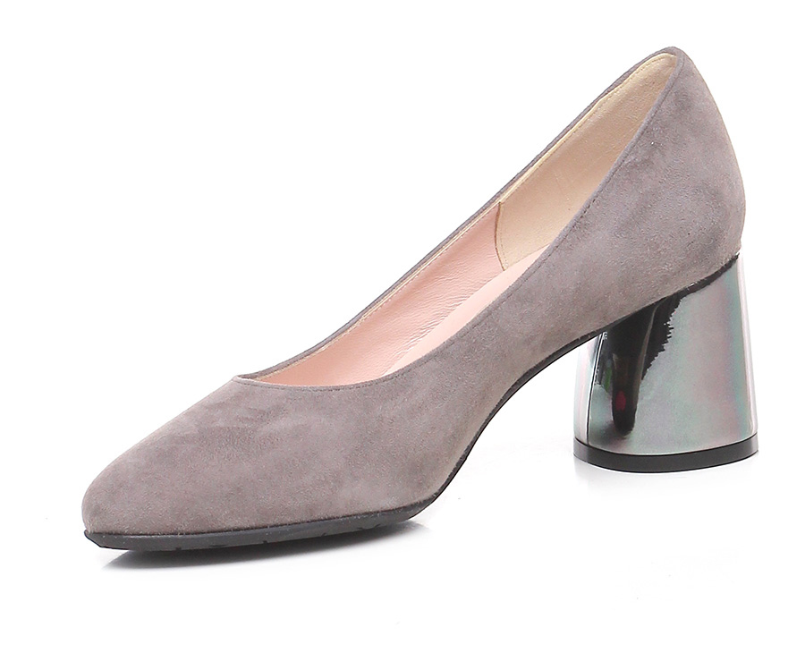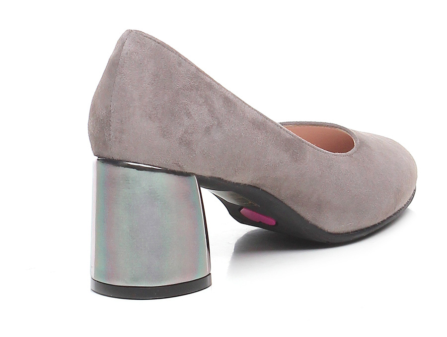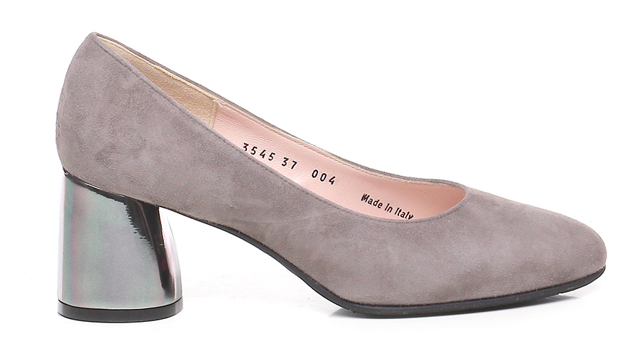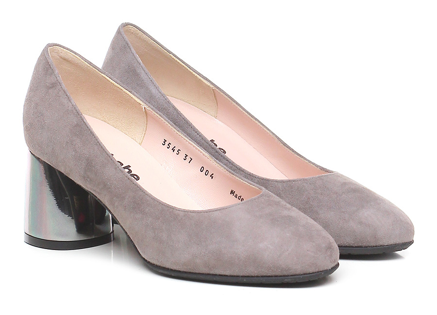 Decolletè in camoscio, suola in gomma. Tacco 65, effetto metallo.