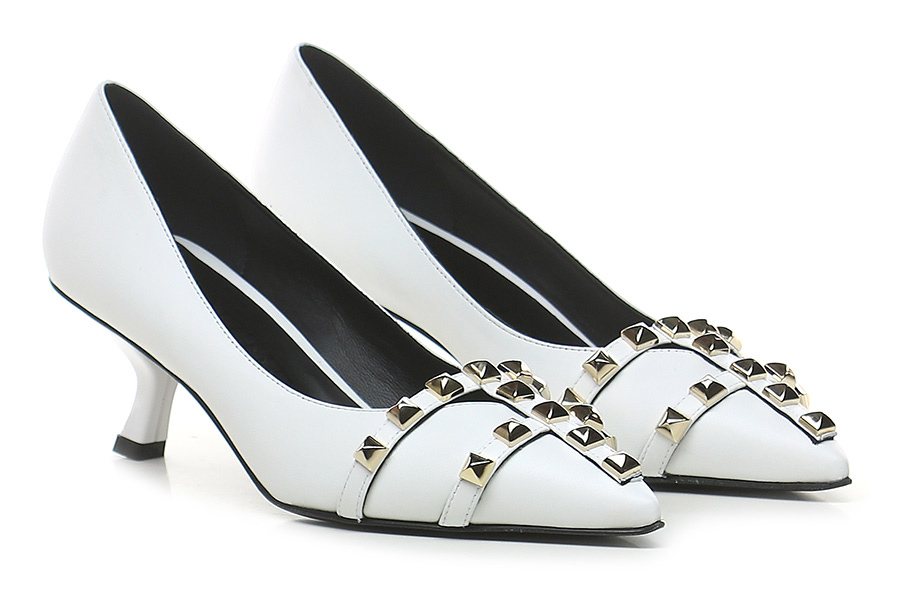 Scarpa in pelle con borchie gold frontali. Suola in cuoio e gomma. Altezza tacco 55mm. Tacco a rocchetto in pvc effetto lucido.