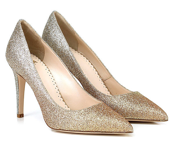 Decolletè in glitter con suola in cuoio, tacco 90.