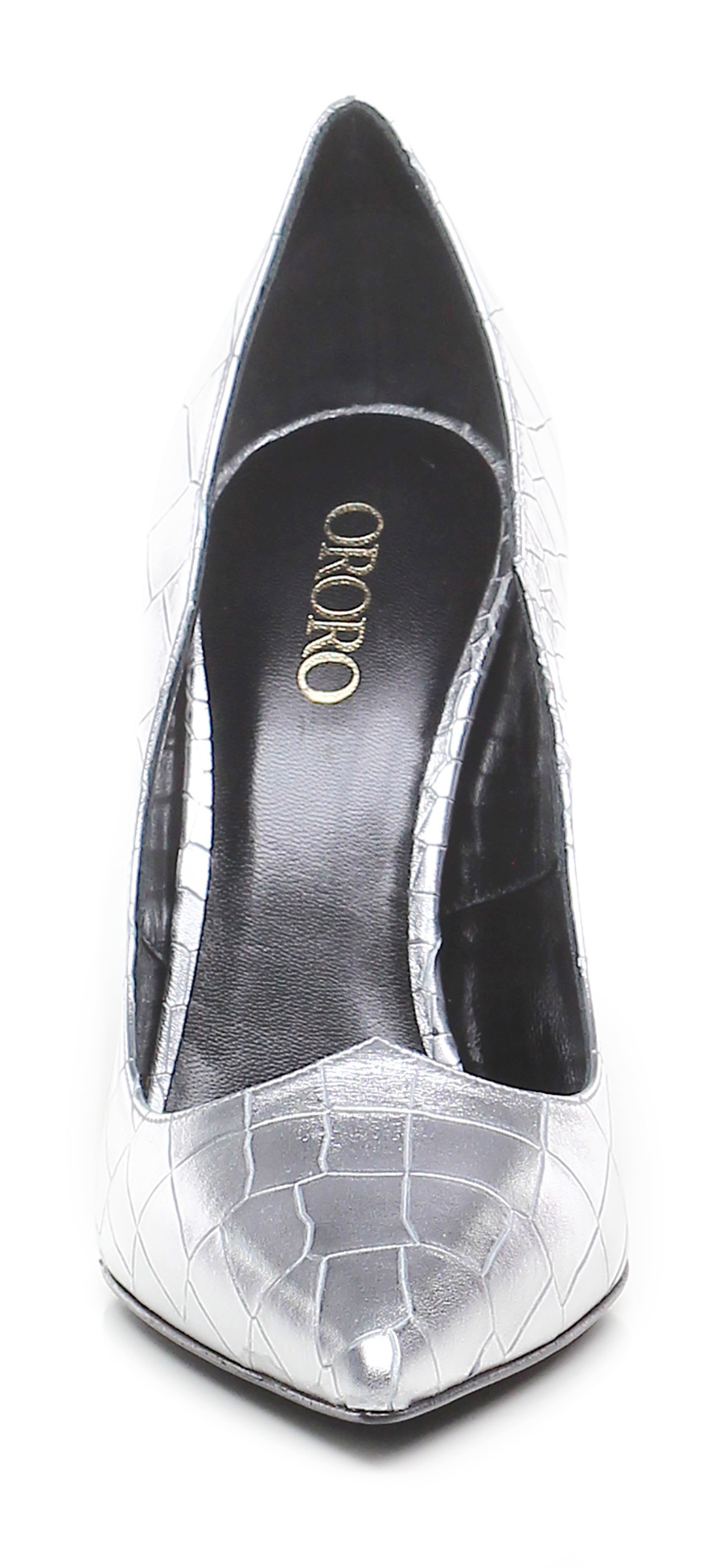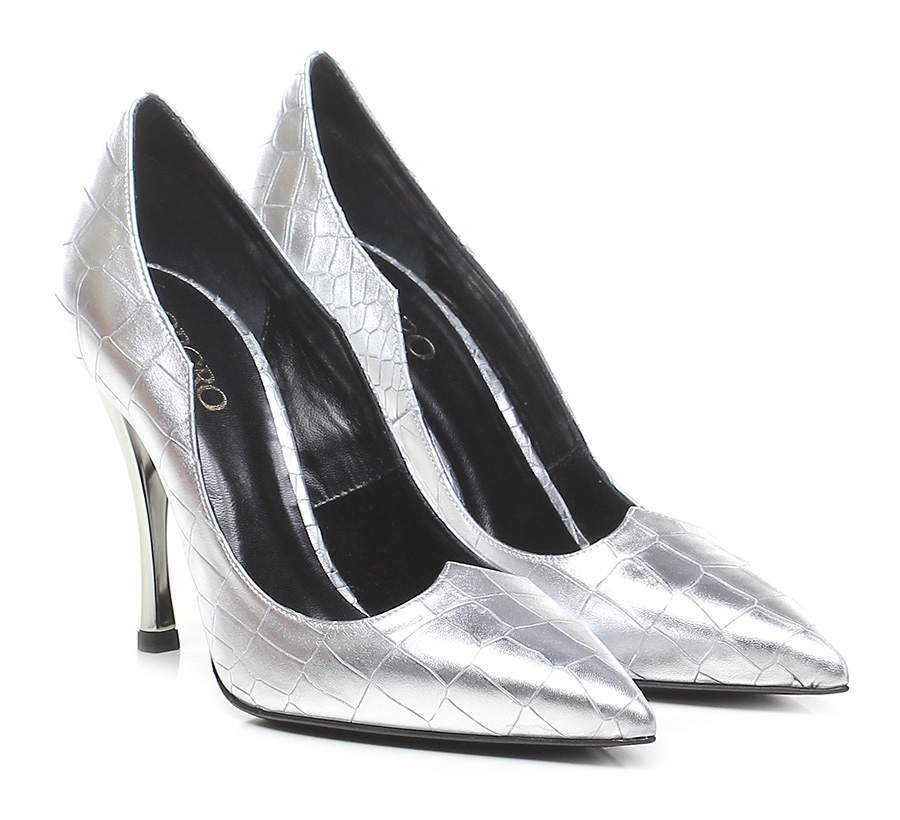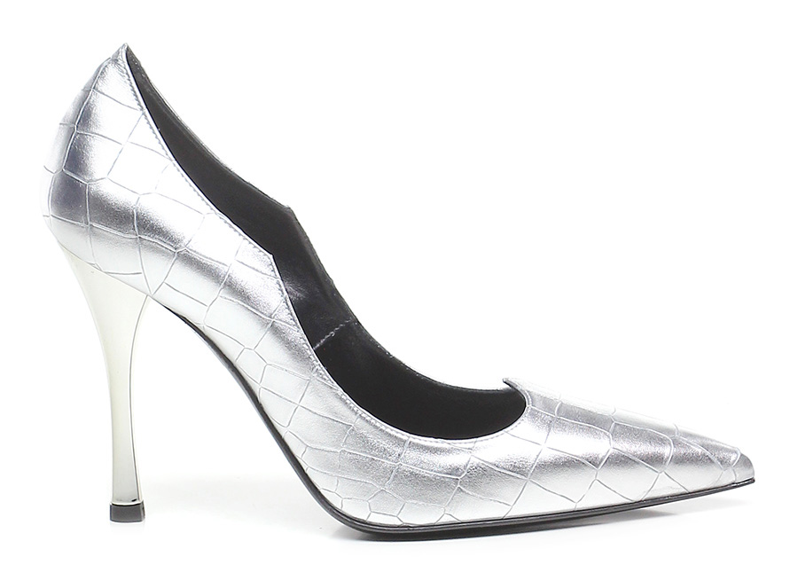 Decollete in pelle laminata stampa coccodrillo, suola in cuoio. Tacco 110, effetto metallo.