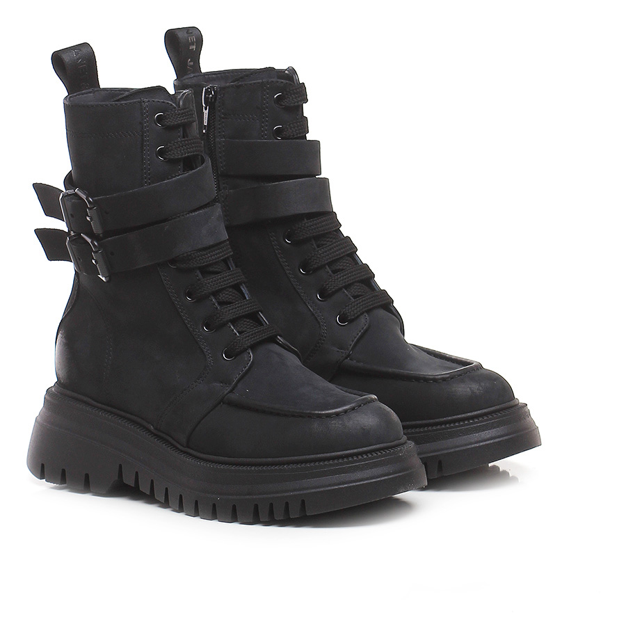 Polacco in nabuck effetto vintage con zip laterale e doppio cinturino alla caviglia con fibbie. Suola in gomma: altezza tacco 55mm, platform 35mm con battuta di 20mm.