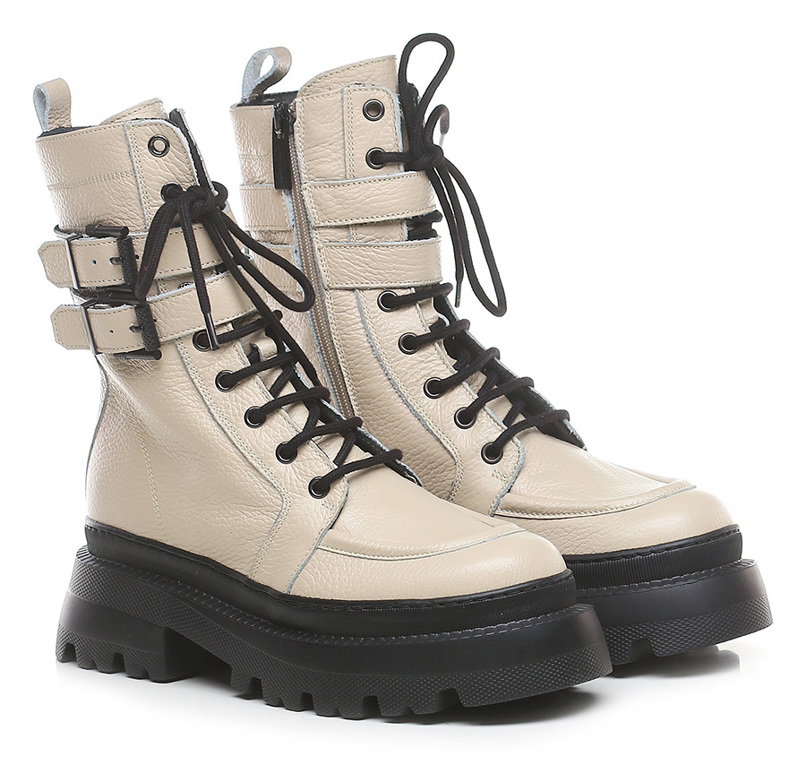 Polacco in pelle martellata con zip laterale e doppio cinturino frontale. Suola in gomma. Altezza tacco 65mm, platform 45mm con battuta 20mm.