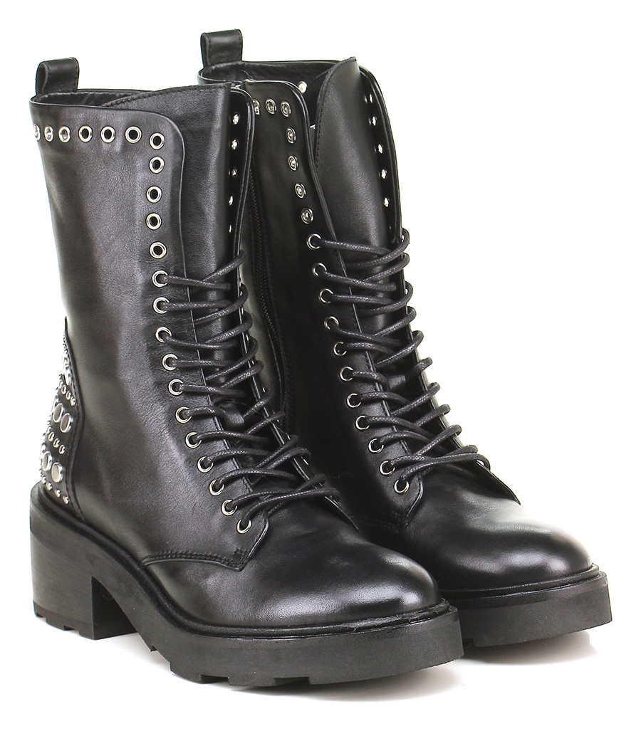 Polacco in pelle con zip su lato interno e borchie su tomaia. Suola in gomma, tacco 60, platform 20 con battuta 40.