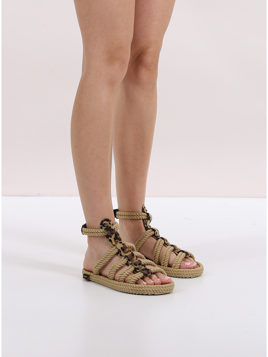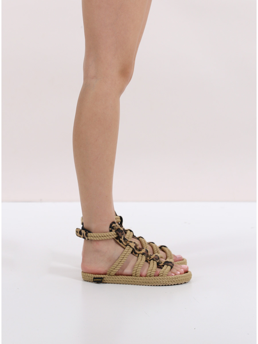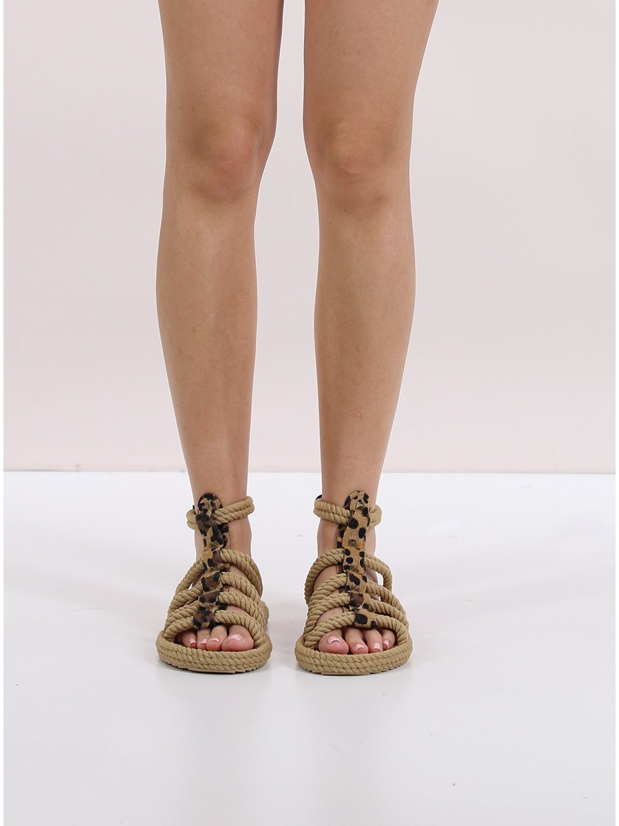 Sandalo in corda intrecciata antibatterica vegana con cinturino sul a strapp e borchie frontali. Suola in gomma riciclabile. Altezza suola 15mm. Handmade 100%.