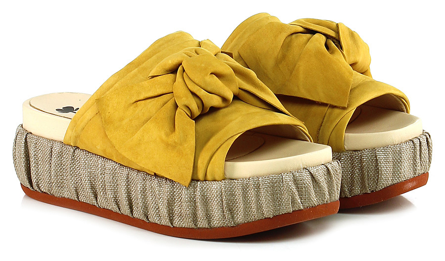 Sandalo basso in camoscio con fiocco frontale e suola in gomma. Tacco 60, platform 50 con battuta 10. Platform in tessuto lavorata.