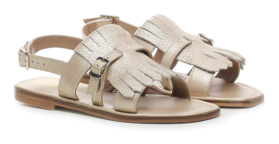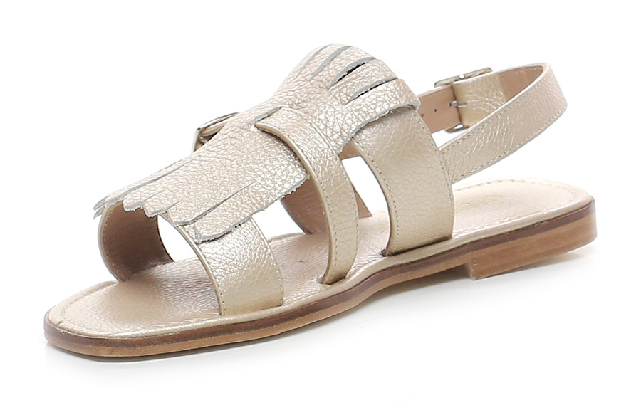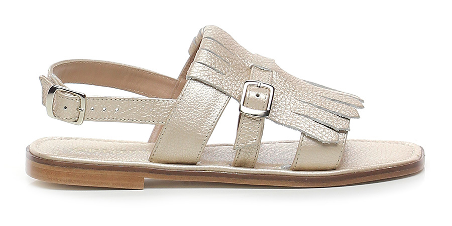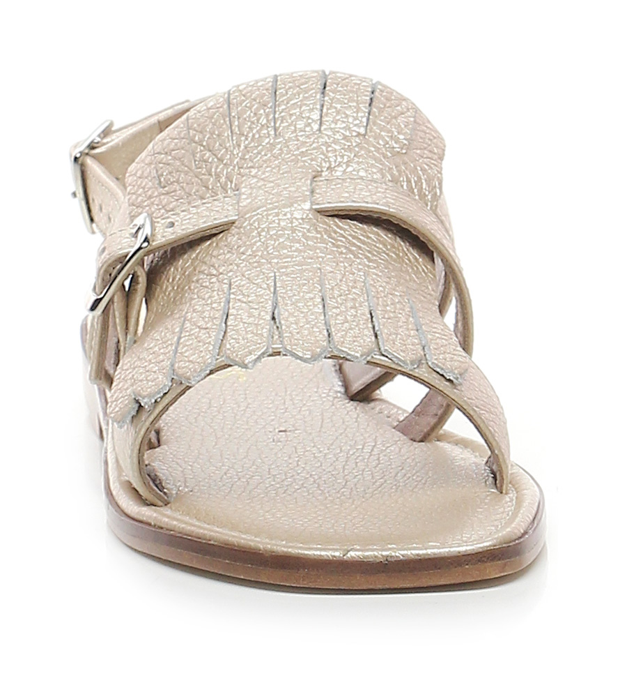 Sandalo basso in pelle martellata laminata con cinturino sul retro e patella frontale con frange, suola in cuoio. Tacco 15.
