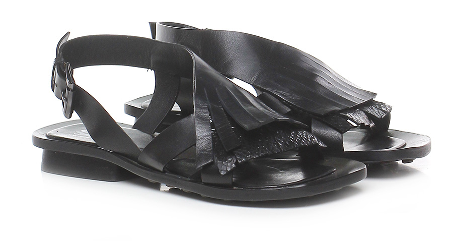 Sandalo basso in pelle e pelle stampa pitone con cinturino sul retro, suola in cuoio e gomma. Tacco 30.