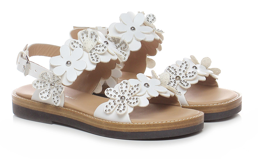Sandalo basso in pelle con cinturino su retro ed applicazione fiori in pelle con borchie su tomaia. Suola in gomma, tacco 30, platform 20 con battuta 10.