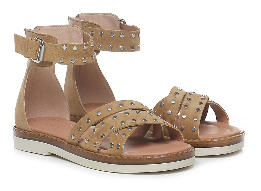 Sandalo basso in camoscio, cinturino alla caviglia con applicazioni di borchie su tomaia, suola in gomma. Tacco 25, platform 20 con battuta 5. Zip sul retro.