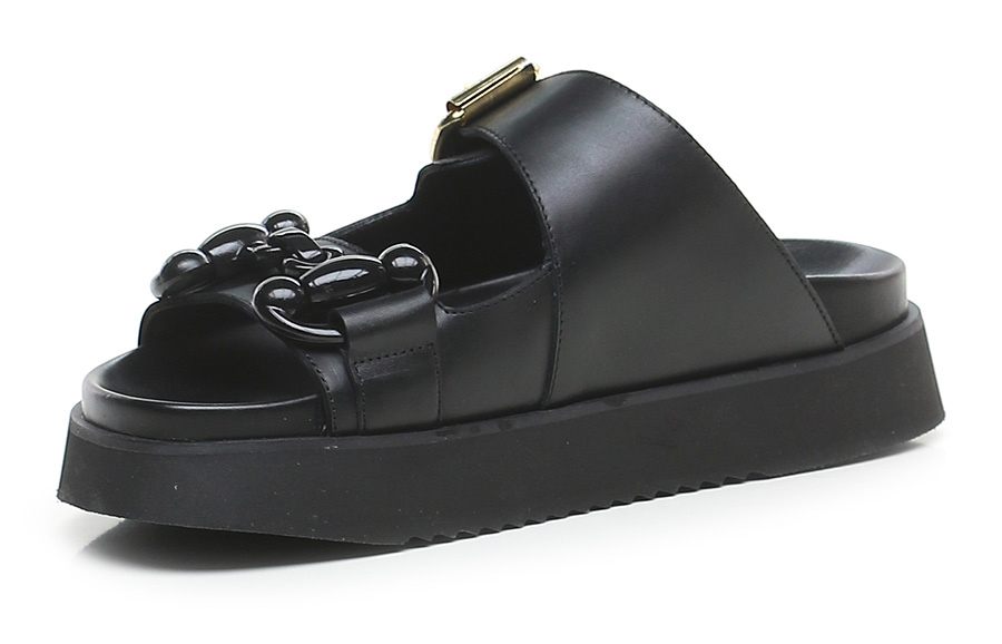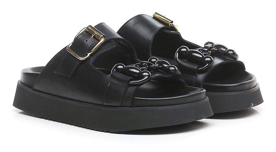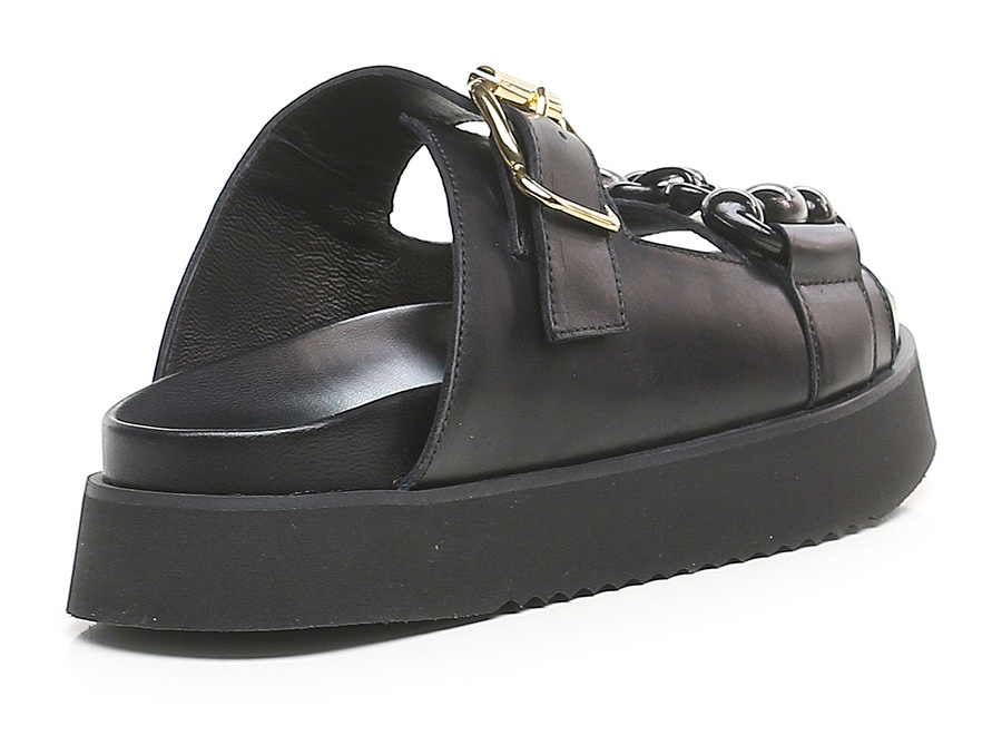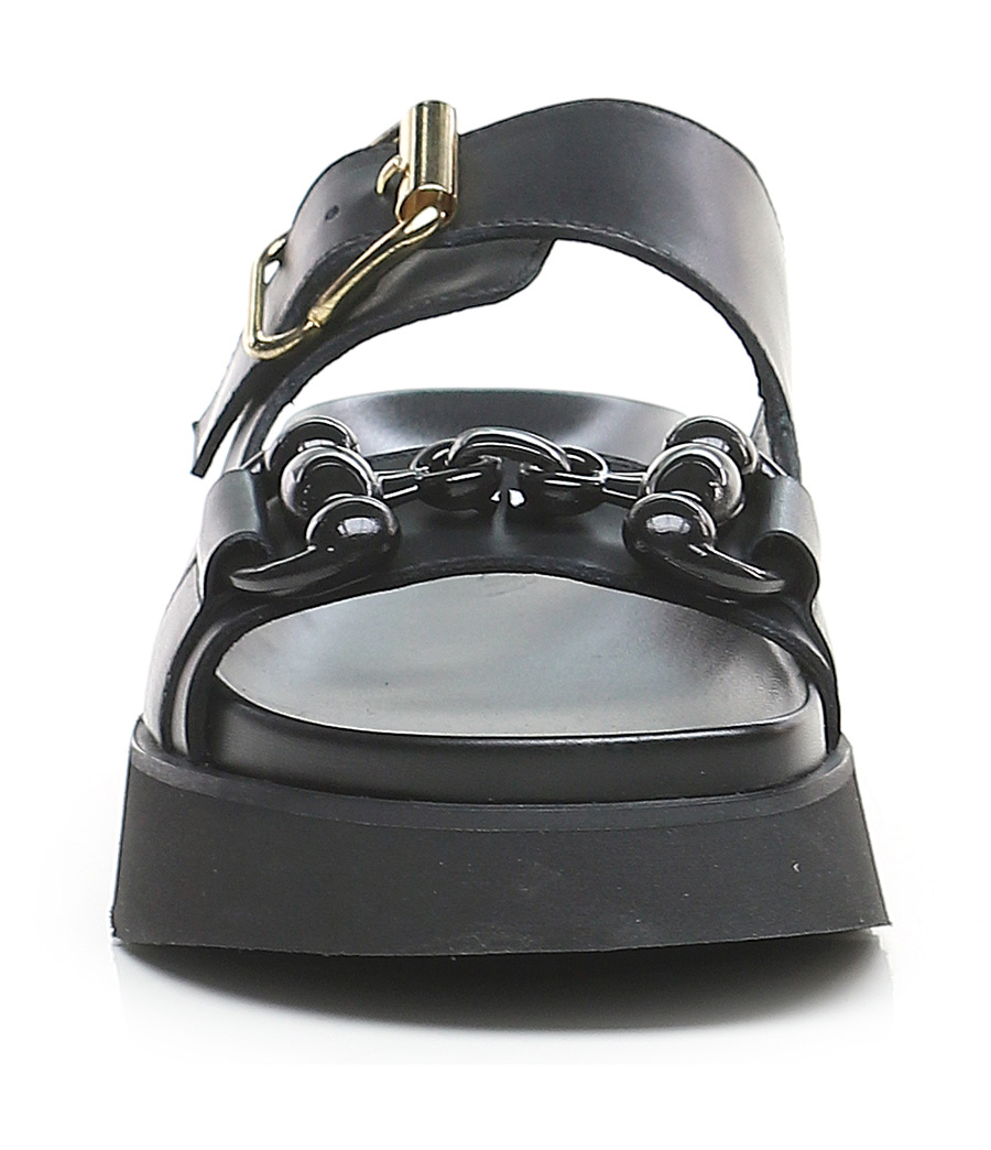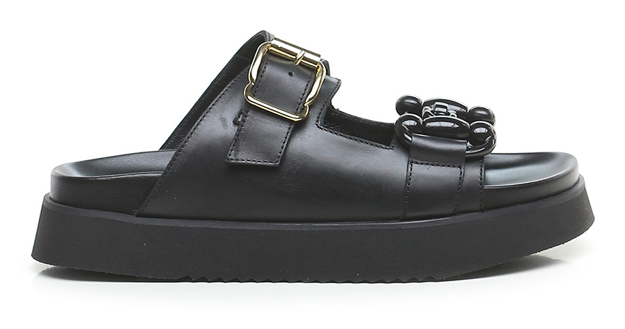 Sandalo in pelle con fibbia ed accessorio frontali. Suola in gomma. Altezza suola 30mm.