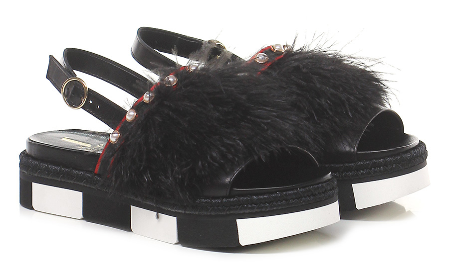 Sandalo basso in pelle vintage e tessuto con cinturino su retro e pietre e piume su tomaia. Suola in gomma, tacco 45, plantare fussbett.