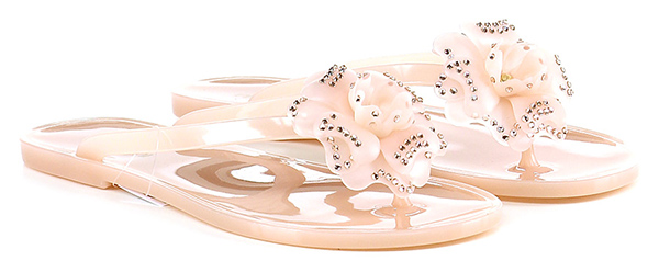 Sandalo basso in gomma con cinturino su retro e Swarovski su tomaia. Suola in gomma, tacco 15.