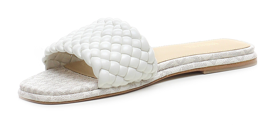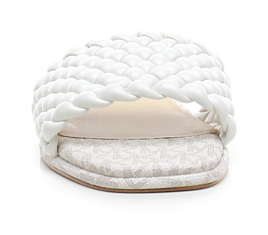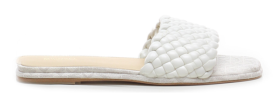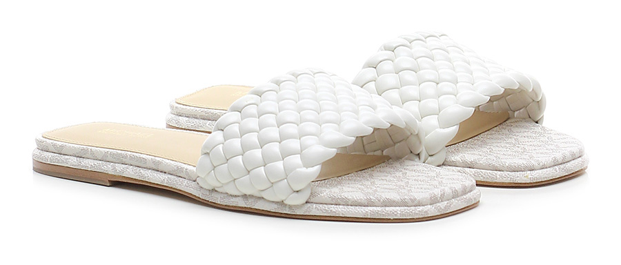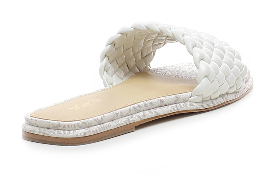 Sandalo in similpelle con fascia intrecciata sul davanti, suola in gomma. Tacco 15, plantare morbido imbottito logato.
