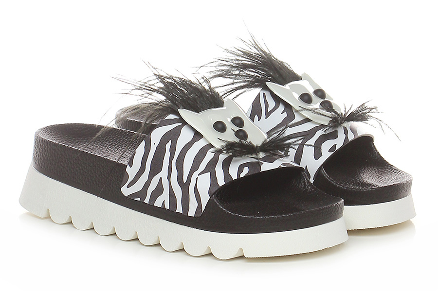 Sandalo basso in pelle con inserto piume frontali e suola in gomma. Tacco 55, platform 40 con battuta 15. Plantare fussbett.