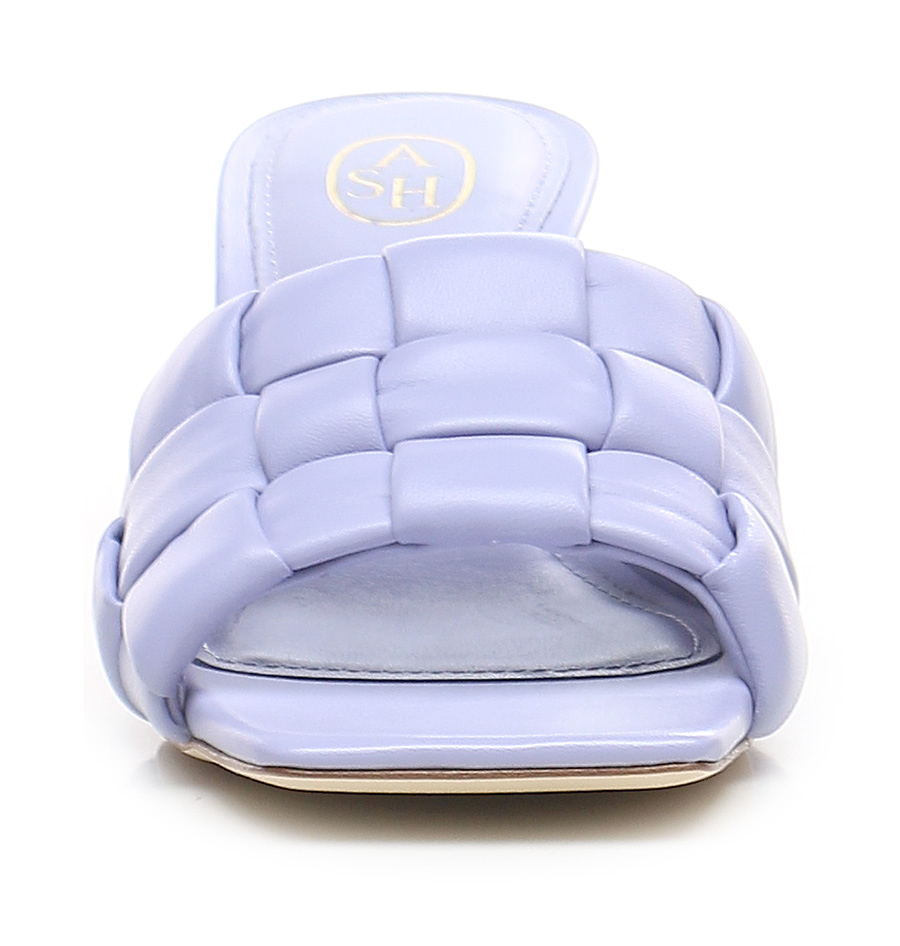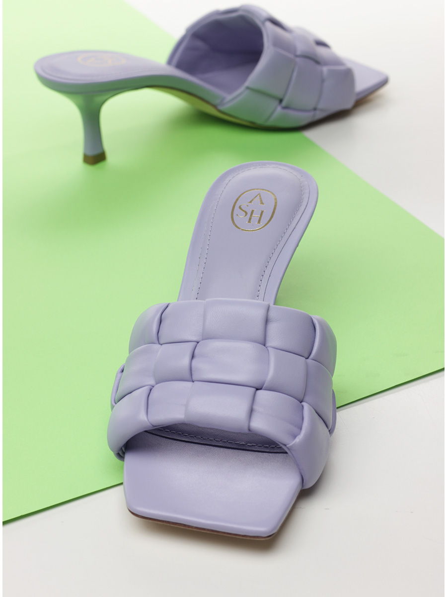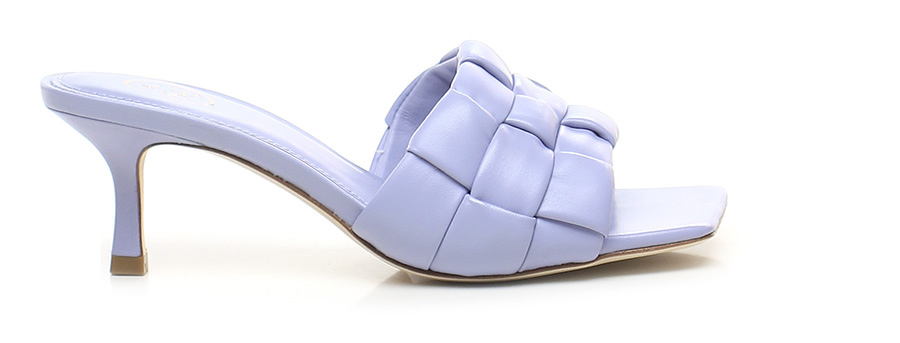 Sandalo in pelle intrecciata con suola in cuoio. Altezza tacco 65mm.