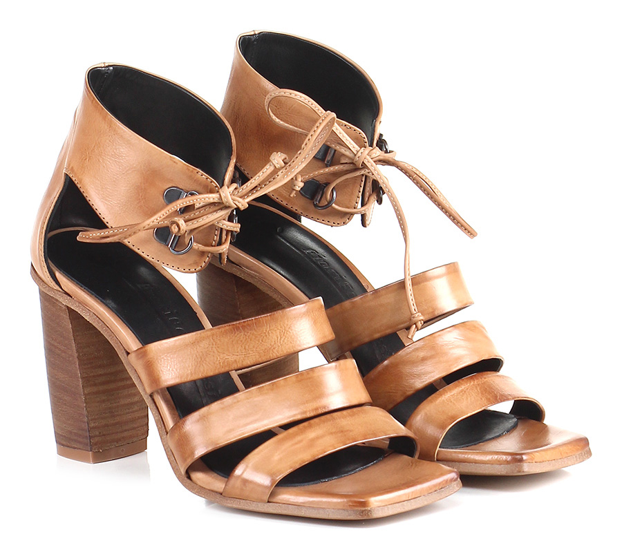 Sandalo alto in pelle delavè vintage con allacciatura alla caviglia e suola in cuoio. Tacco 90.